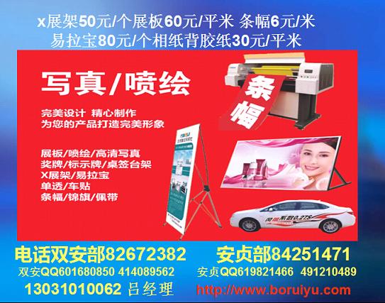 我公司制作易拉寶、X展架、拉網(wǎng)、燈片、燈箱布、網(wǎng)格布、單透、高光相紙、掛軸、車帖等寫真噴繪產品,進口機器制作,質優(yōu)價廉,歡迎惠顧!寫真輸出(燈片 全透片 海報背膠 相紙),噴繪輸出(網(wǎng)格布 燈布 車身貼),制作 易拉寶 X架 拉網(wǎng)展架 電腦刻字,KT板,大型活動,及各類展版噴繪,寫真,展板,展架,易拉寶,X展架,,廣告條幅。